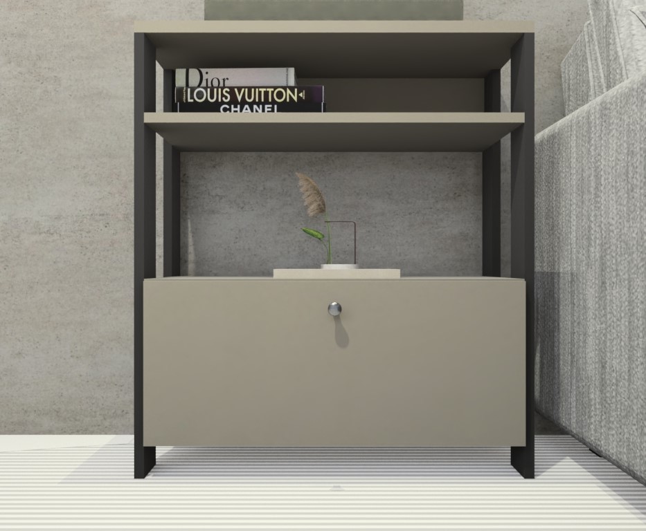 Conta com uma porta basculante, que oferece um espaço interno discreto e funcional para armazenar diversos itens do dia a dia — desde objetos decorativos até utensílios e acessórios.